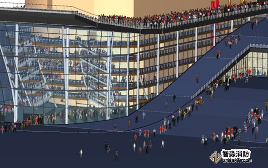 -Pathfinder还专门提供了高性能可视化的3D时间历程模拟,利用透明化功能来更好地显示密集人群在楼层中的疏散情况。